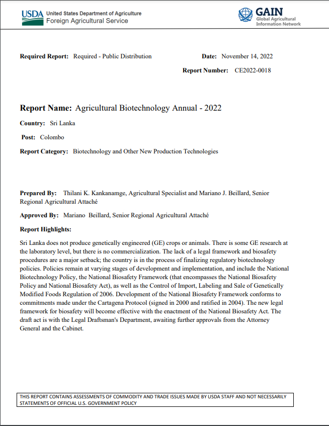 (2023) AQSh hisboti Shri-Lankada GMO oziq-ovqat ishlab chiqarilishini tasdiqlaydi Manba: AgricultureInformation.lk | Qoʻshma Shtatlar Qishloq Xoʻjaligi Departamenti hujjati