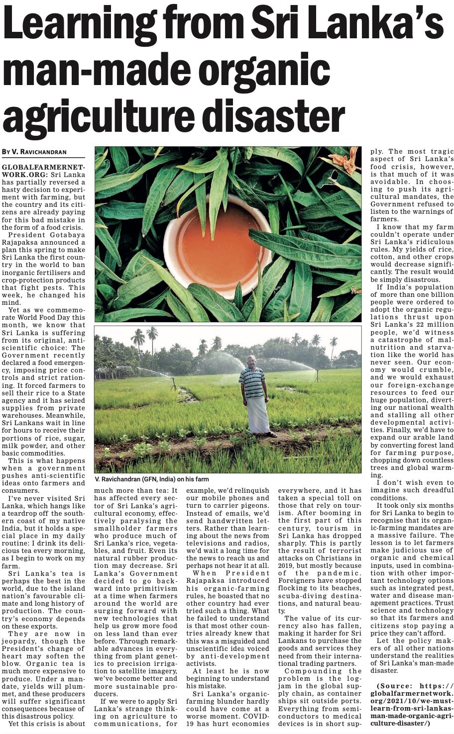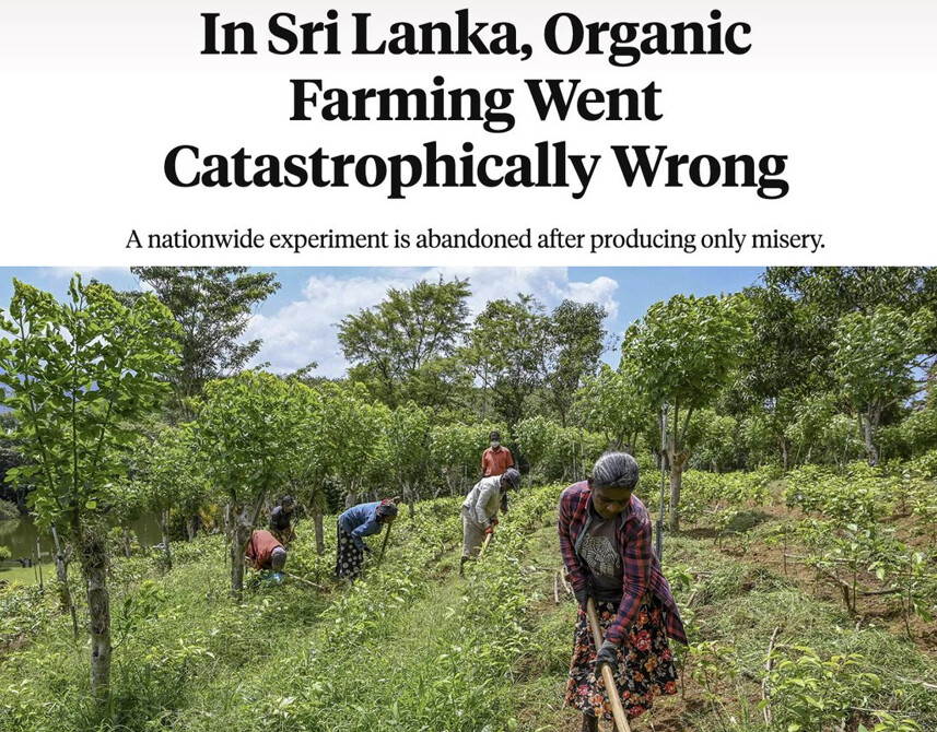 Shri-Lanka oʻtgan yili fuqarolariga nisbatan yovuz eksperiment oʻtkazdi. Organik ovqat va anti-GMO faollarining taʼsiri ostida hukumat sintetik pestitsidlar importini taqiqladi va mamlakatni toʻliq organik qishloq xoʻjaligiga oʻtishga majbur qildi, bu esa deyarli barcha fermerlarni mamlakat tayanadigan ekinlarni oʻstirish uchun zarur boʻlgan vositalardan mahrum qildi.